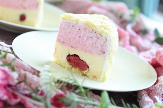 イチゴを8割入れ込んだムースに、セミドライ苺入りのベークドチーズ♪